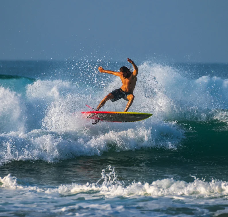 A serene crescent-shaped beach popular for surfing and its tranquil ambiance.